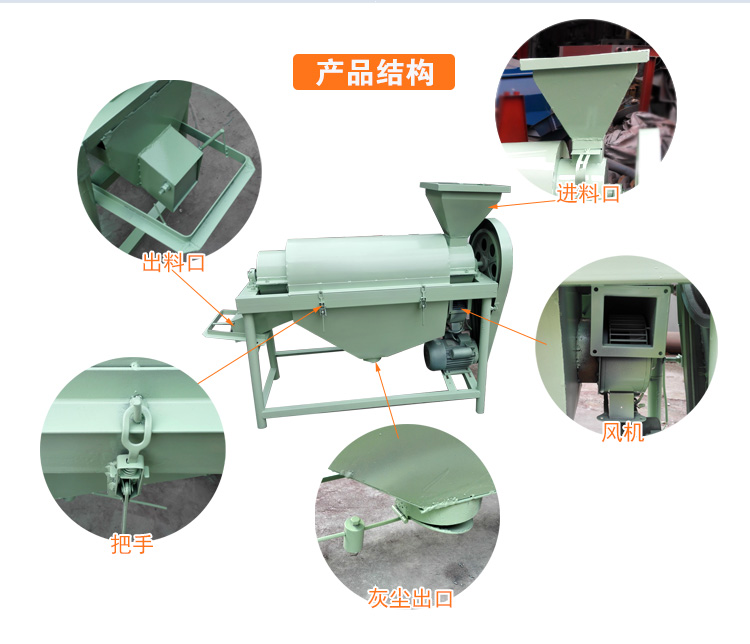 進料口里面有一個調節擋板可以調節物料進入多少。出料口為了配合裝袋我們上面有袋子的掛鉤,當然出料口可以根據您的實際情況進行定做,風機就是將水稻芒還有灰塵等輕小物料直接吹出來,電機我們采用的是全銅線圈電機,耐用,質量好。