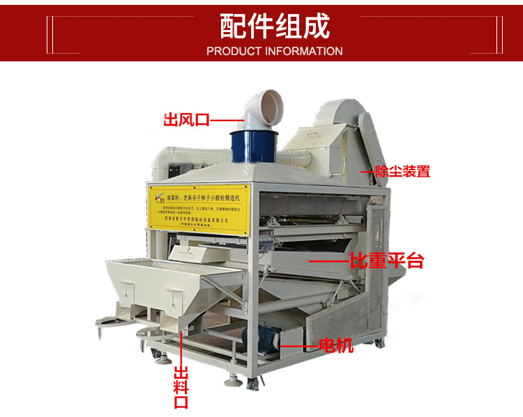 該機按物料大小、重量或外形輪廓的差異進行風選和比重篩選相結合的谷物清選設備。該機采用正壓的方式,利用氣流和振動摩擦對物料產生的綜合作用,比重較大的物料沉降到底層,通過篩面的振動摩擦向高處移動,比重較小的物料經氣流作用則懸浮在料層的表面向低處流動,以達到按比重分離的目的。該機能有效剔除物料中的雜質【霉爛變質粒、蟲蛀粒、黑粉病粒、秕谷粒、芽谷粒、大重雜、小重雜、粉塵等】。該機廣泛用于玉米、小麥、水稻、決明子、大豆、蔬菜等農作物種子和形態的草籽,如牧草種、園藝種、林木種等種子的清選加工。