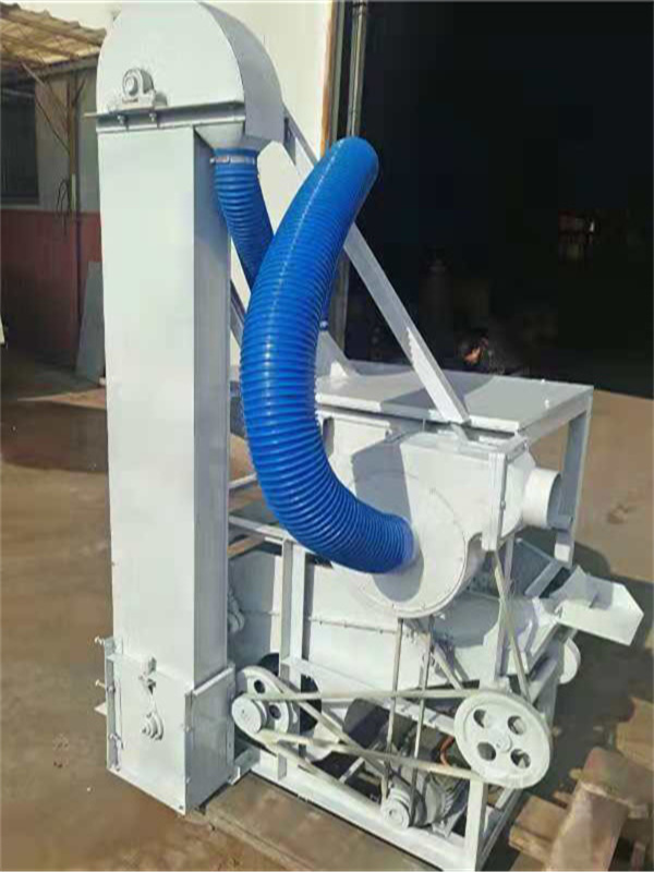 本機為三層篩網,先經過進料口處風機抽風,直接抽走重量輕的雜葉或麥秸稈,上層篩的初次篩分再把大雜清理過,好的糧食(種子)直接落到下層篩網上,下層篩網會把糧食(種子)中的小雜.小石子.有缺陷的糧食(種子)直接漏掉,完好的糧食(種子)會從出料口篩分出來。該小型清糧機解決了揚場機的功能單一,不能有效去除石子.土塊的缺陷,更能為清理、凈選糧食(種子)帶來滿意的效果。該機有占地小,移動方便,便以維修,除塵除雜效率明顯,能耗低,使用簡便等優點。