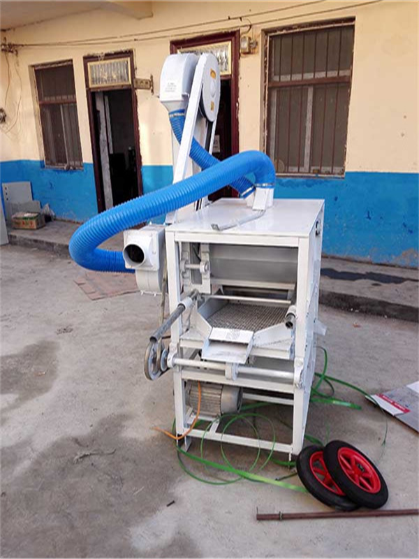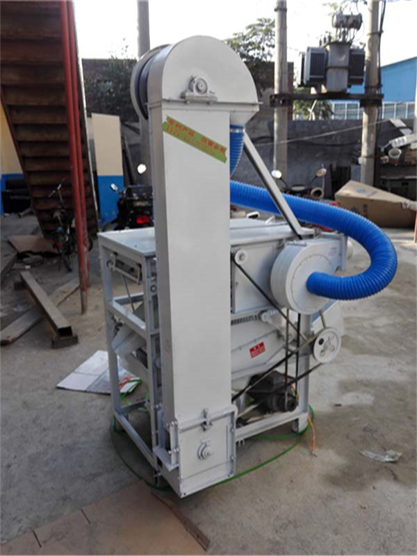 本機為三層篩網,先經過進料口處風機抽風,直接抽走重量輕的雜葉或麥秸稈,上層篩的初次篩分再把大雜清理過,好的糧食(種子)直接落到下層篩網上,下層篩網會把糧食(種子)中的小雜.小石子.有缺陷的糧食(種子)直接漏掉,完好的糧食(種子)會從出料口篩分出來。該小型清糧機解決了揚場機的功能單一,不能有效去除石子.土塊的缺陷,更能為清理、凈選糧食(種子)帶來滿意的效果。該機有占地小,移動方便,便以維修,除塵除雜效率明顯,能耗低,使用簡便等優點。